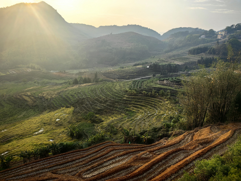 春天來了,萬物復蘇,在夕陽的照耀下,梯田如鏈似帶,色彩斑斕,好似一幅唯美的油畫。夜幕降臨宿營石井,村里茶香四溢,農民穿梭辛勤制茶。寧靜的山村夜晚,站在觀景臺上,俯瞰千畝梯田,只見一條條螢火燈帶,閃爍著幽綠之光,若隱若現,蛙鳥蟲齊聲合唱,求偶聲此起彼伏,演奏著萬物生長的交響樂章。仰望天空,一輪明月繁星簇擁,天上地下融為一體,置身其懷抱中,伴著潺潺流水,我酣然入夢。