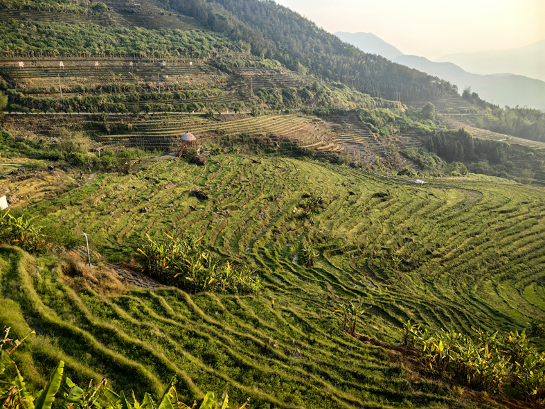 栽種好的秧苗,一行行整齊有序,由點成線,由線成片,由片成面,扎根肥沃的土壤,吮吸著豐富的養料。盛夏來臨,稻禾不斷分蘗、拔節,生生不息,快速成長,梯田漸漸由淡綠轉翠綠再變青綠,并且不斷地升高。一陣陣山風吹過,一排排稻禾隨風搖曳,連著山腰的茶和山頂翠竹林木,全體都舞蹈了起來,匯聚成洶涌澎湃的綠色波浪。此刻,空氣中彌漫著泥土與稻禾的清香,令人神清氣爽,呼吸都變得輕盈起來,有些飄飄欲仙了。
