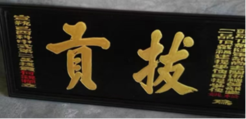 曾祖父的獨子何觀瀾,自幼便浸潤在島石村濃厚的學風中。清光緒十二年出生的他,天資聰穎,加之曾祖父何名暢深知"讀書可振家聲",且看重島石與黎川兩地的文化淵源,便不惜重金送他赴江西黎川等地的新式學堂求學。在黎川的求學時光里,何觀瀾不僅深耕經史子集,更系統學習了算術、格致、博物等西學知識,開闊了眼界,也練就了扎實的學識功底。年輕時的何觀瀾先娶了原配妻子,可惜兩人未有生育;后續娶二房,先后生下了大伯何金三和叔叔何金海。清朝末年,祖父何觀瀾參加科舉相關選拔,于宣統元年(1909年)考取“拔貢”功名——這在清代是貢生中的首等,每州縣學僅一名名額,極為難得。朝廷特意賜下黑底金字匾額,由時任閩浙總督松壽、福建提學使姚文倬共同題字,上書“拔貢”二字,側邊落款“宣統己酉科中式第二名拔貢何觀瀾立”,此匾額,至今仍被族人珍藏。松壽是清朝最后一任閩浙總督,總管閩浙軍民政務,與祖父并無直接交集,題匾是按清代慣例對拔貢功名的官方認可;而福建提學使姚文倬是當時總管福建文教的最高長官,祖父考取拔貢時曾受其親自考核,姚文倬對祖父的學識十分贊賞,后來還書信勉勵他“勤于職守,造福一方”,這份書信被祖父珍藏多年,可惜后來遺失。